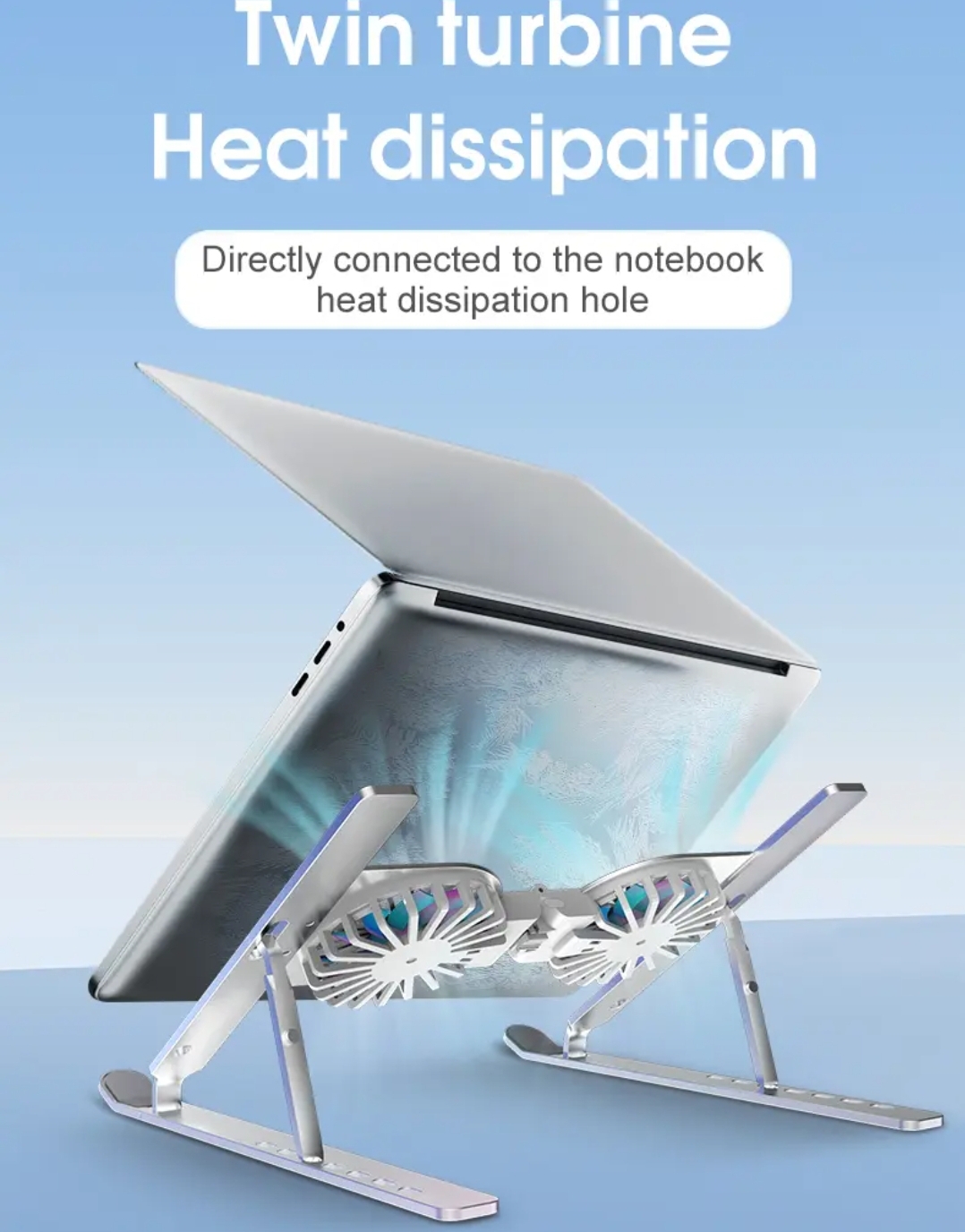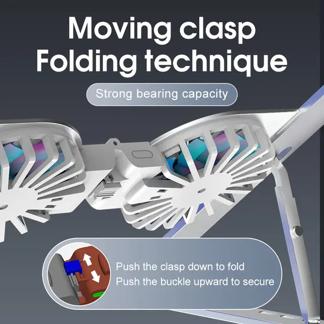 Support réglable pour ordinateur portable vous permettant de soulever votre ordinateur portable jusqu’à une hauteur de vision ergonomique, soulageant ainsi la douleur dans votre cou et votre dos. **Hauteur réglable, design ergonomique, augmente le confort du bureau. ** Les ventilateurs doubles aident à disperser la chaleur de l’ordinateur portable pour une fonctionnalité améliorée. ** Conception de boucle pour plier et tenir, support pliable à utiliser partout où le travail vous emmène. ** Branchez simplement le câble USB à l’ordinateur portable ou à la charge. ** Les coussinets en silicone sur le dessus du support de l’ordinateur portable protègent l’ordinateur portable contre les rayures et le glissement.** Semelle en caoutchouc pour éviter le glissement et les rayures des tables ou des bureaux. |